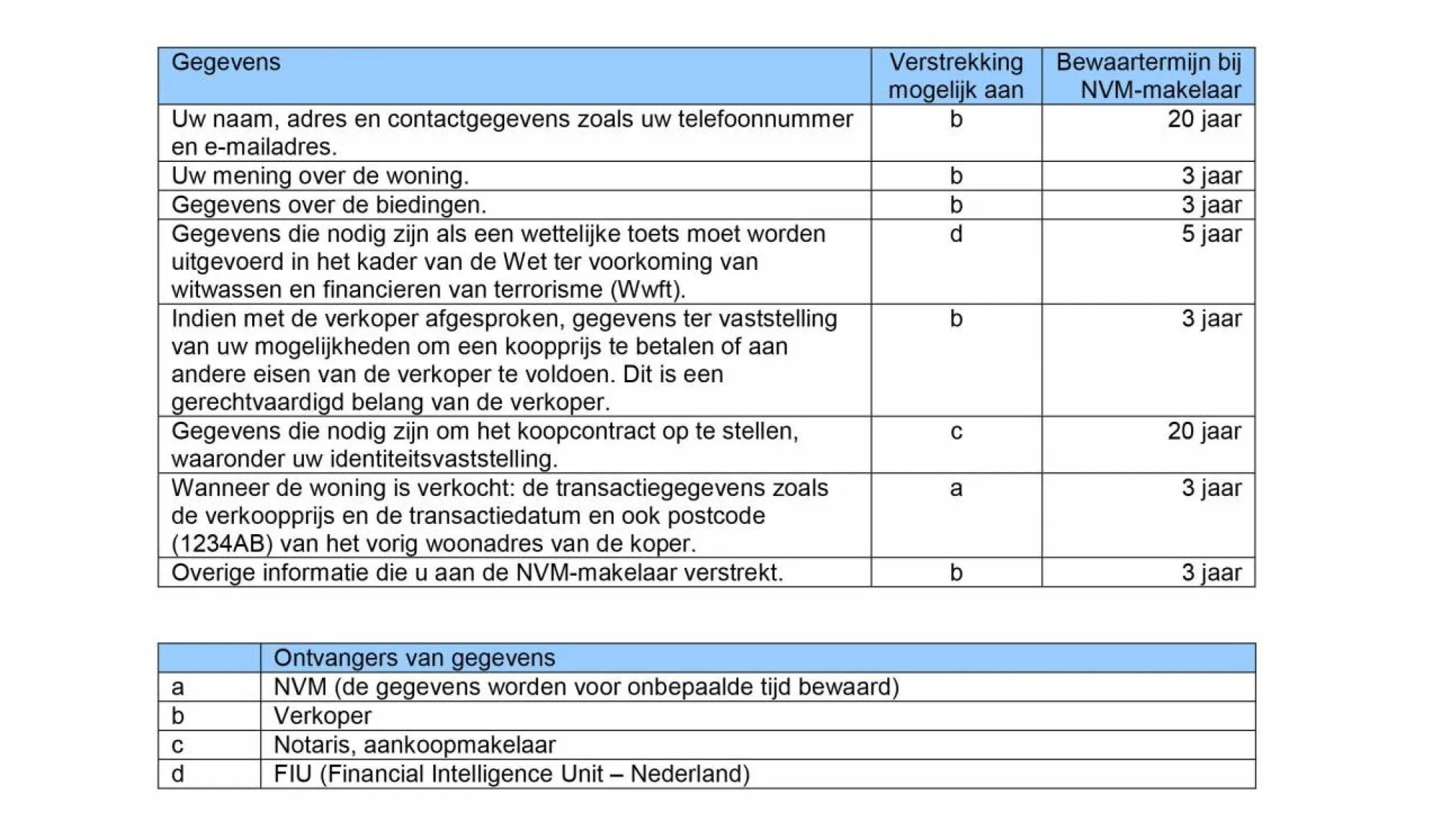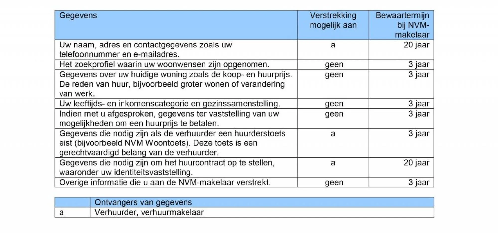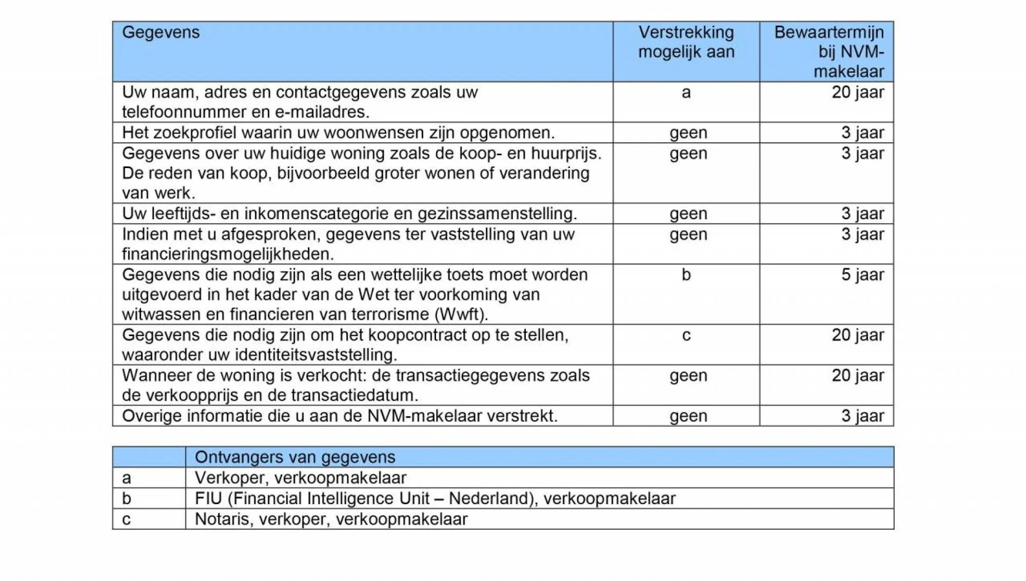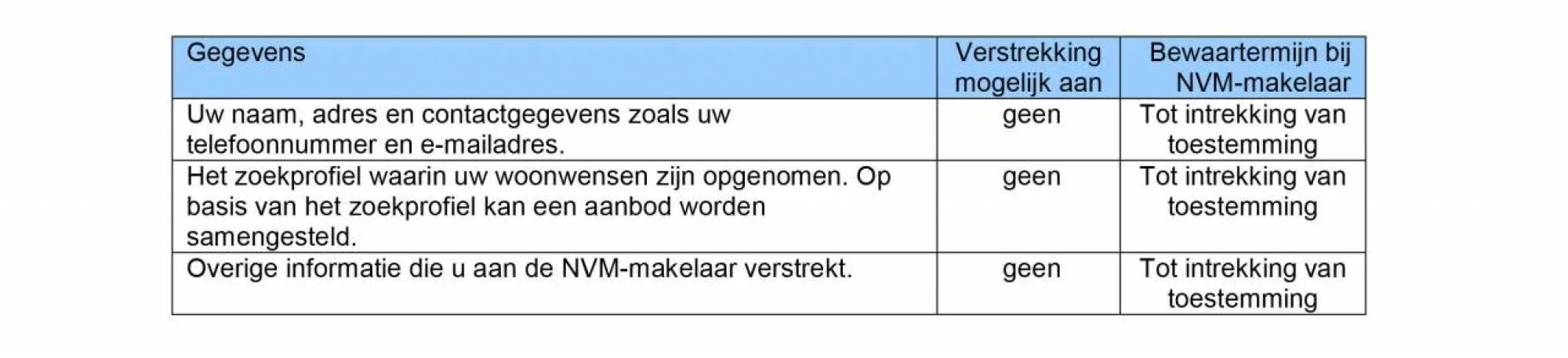 De NVM-makelaar bewaart de gegevens niet langer dan noodzakelijk. Een aantal gegevens bewaart de NVM-makelaar echter langdurig: