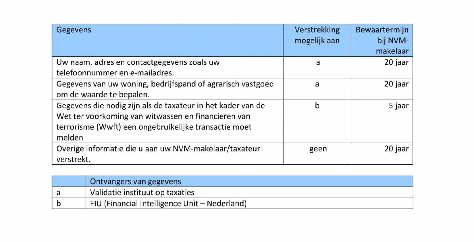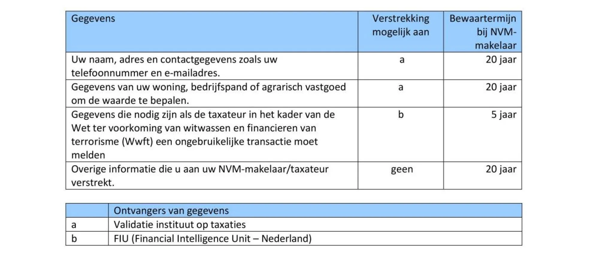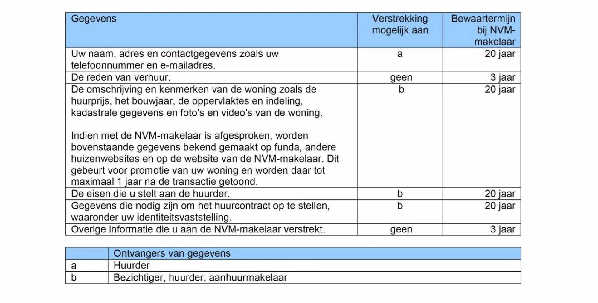 De NVM-makelaar bewaart de gegevens niet langer dan noodzakelijk. Een aantal gegevens bewaart de NVM-makelaar echter langdurig: