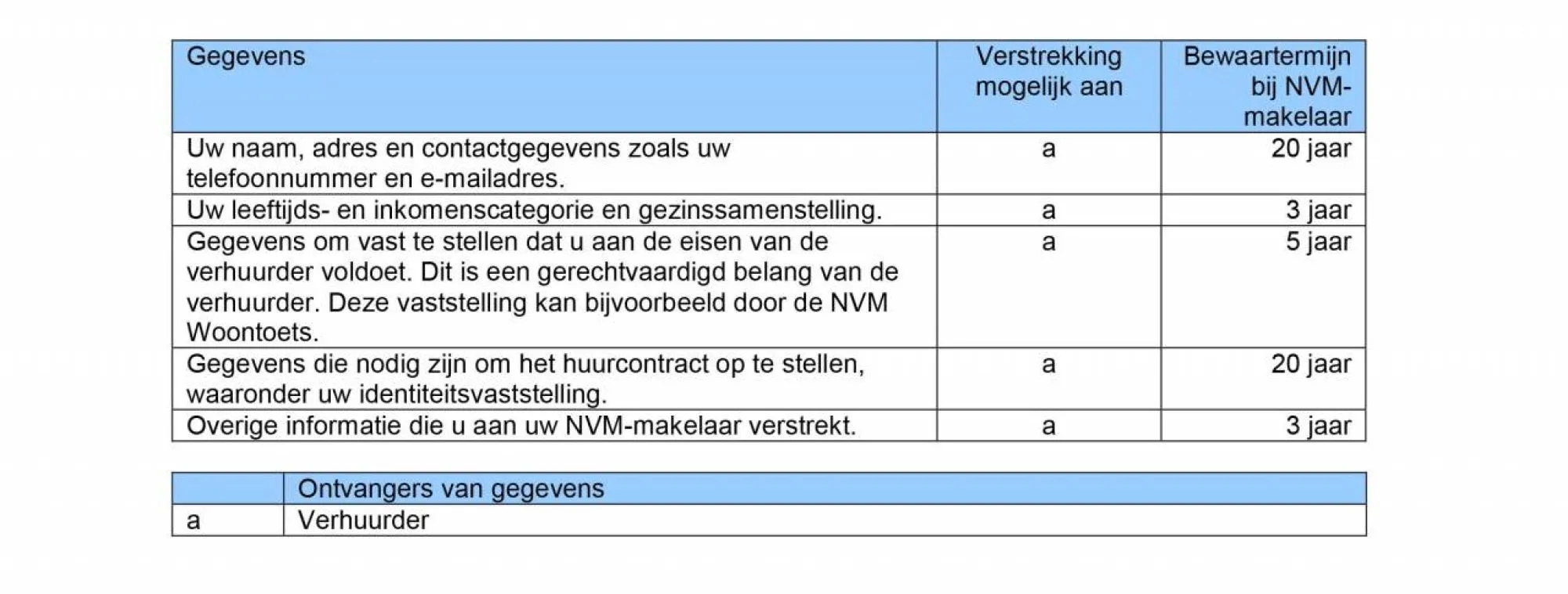 Het doel van dit contact is om in opdracht van u een geschikte huurwoning te vinden met een passend huurcontract. Daarbij stelt de NVM-makelaar ook uw identiteit vast. De volgende gegevens kunnen worden verwerkt: