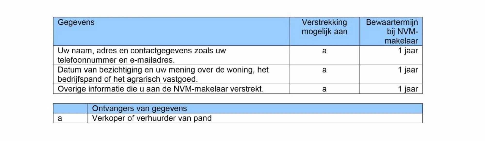 Het doel van dit contact is om in opdracht van u een voor u passende woning te vinden, namens u de onderhandelingen uit te voeren en de transactie te begeleiden. Daarbij stelt de NVM-makelaar ook uw identiteit vast. De volgende gegevens kunnen worden verwerkt: